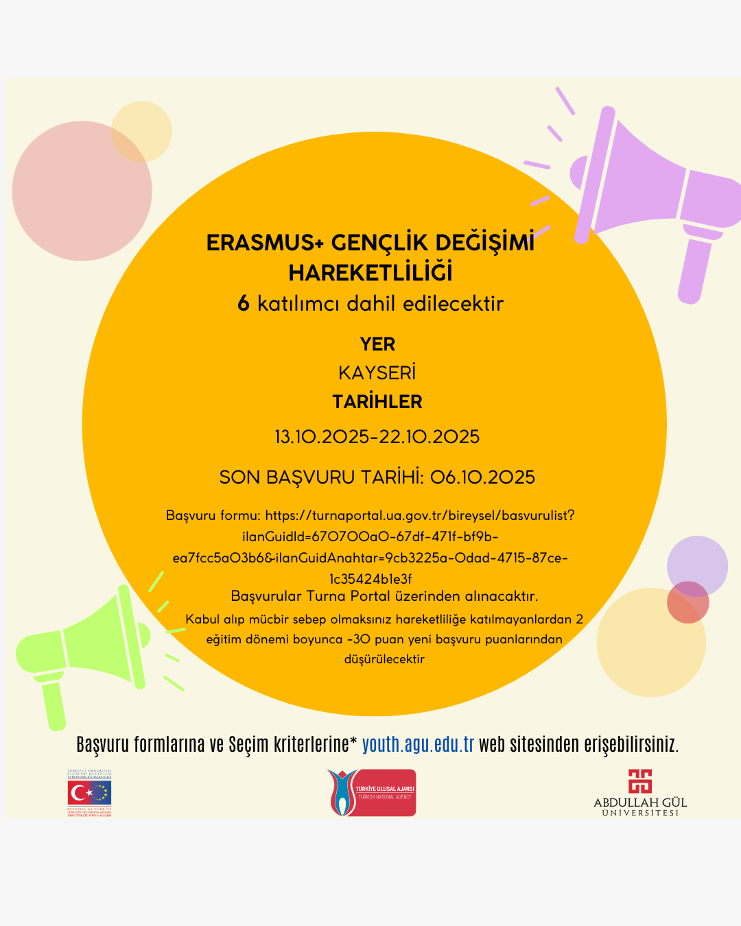 13.10.2025-22.10.2025 tarihleri arasında Kayseri ilinde farklı ülkelerden katılımcıların dahil olacağı Gençlik Değişimi Hareketliliği gerçekleştirilecektir. Hareketlilik kapsamında 6 katılımcı seçilecektir.