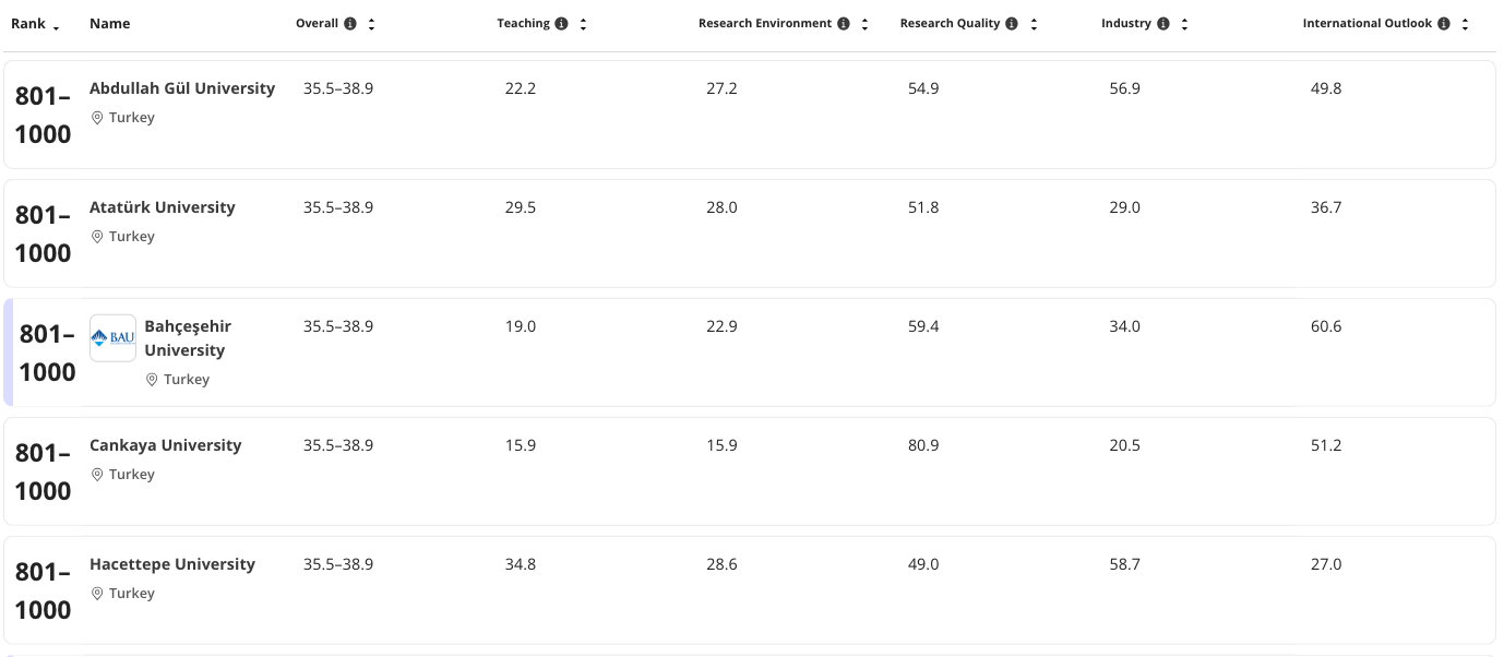 Koç, ODTÜ, Sabancı, Boğaziçi, İTÜ, Bilkent, Kadir Has, Yıldız Teknik, Atatürk, Bahçeşehir, Çankaya, Hacettepe, İstanbul Medipol ve Özyeğin Üniversiteleri girdi.